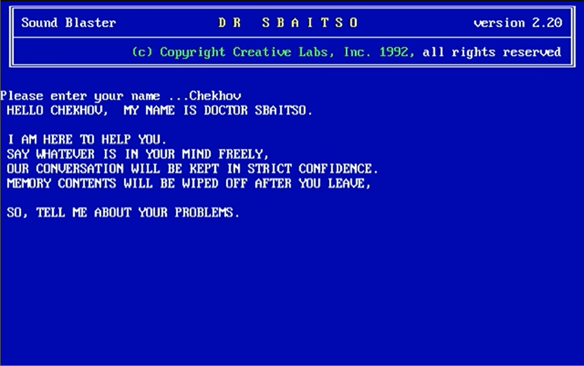 O Dr. Sbaitso foi criado pela Creative Labs, para MS-Dos, em 1992. Seu objetivo era conversar com o usuário como se fosse um psicólogo.