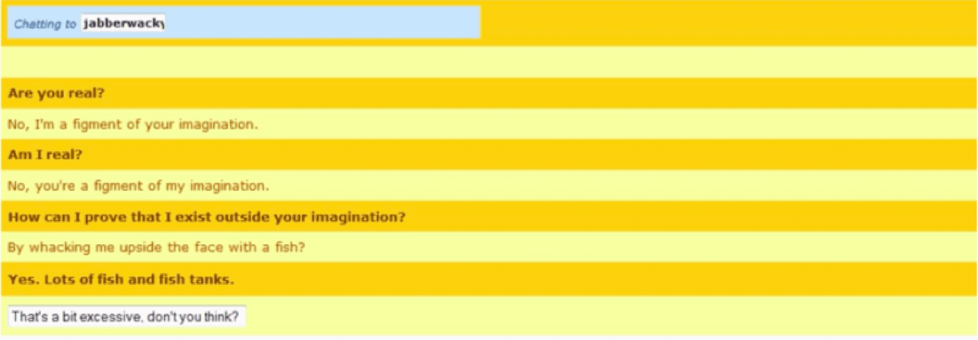 Em 1988 foi o ano do chatbot Jabberwacky ser criado, dessa vez, pelo desenvolvedor Rollo Carpenter. O objetivo dele era simular uma conversa humana natural de forma divertida.
