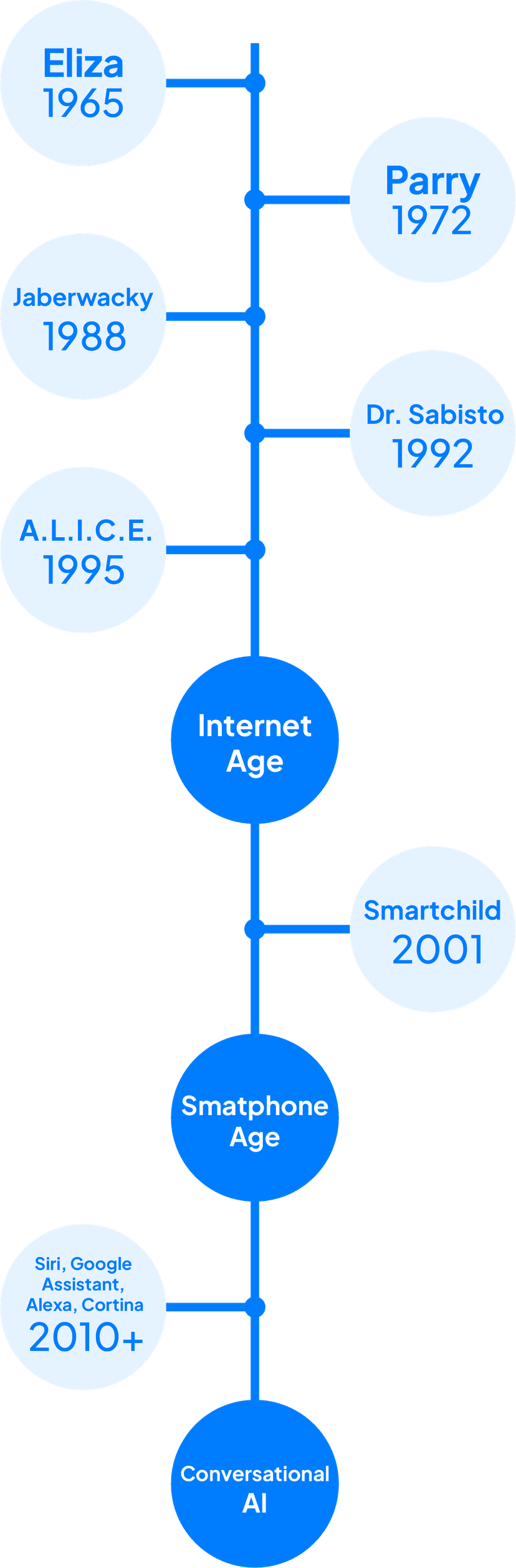 Chegamos ao modelo de chatbot que abrange ferramentas tão conhecidas atualmente como a Siri (2010), Google Assistant (2012), Cortana (2014) e Alexa (2014).