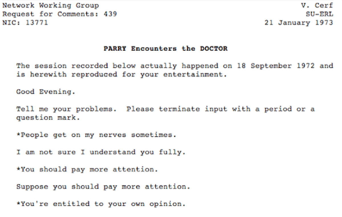 Cerca de dez anos depois, em 1972, o PARRY foi criado pelo psiquiatra Kenneth Colby.